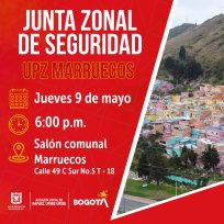 Participa en la Junta Zonal de Seguridad en la UPZ Marruecos este jueves 9 de mayo a las 6:00p.m. en el Salón Comunal Marruecos - Calle 49C Sur Nº 5T 18.