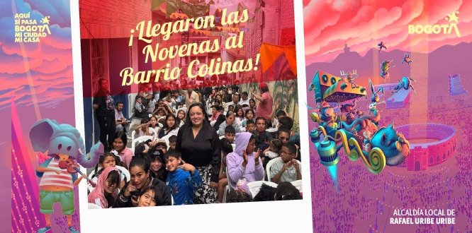 En el séptimo día de la Novena de Aguinaldos, la Alcaldía Local de Rafael Uribe Uribe, en cabeza de la alcaldesa Diana Carolina Sánchez Castillo, compartió un emotivo espacio de encuentro y celebración con la comunidad del barrio Colinas, llevando alegría navideña a niñas, niños y familias del sector.